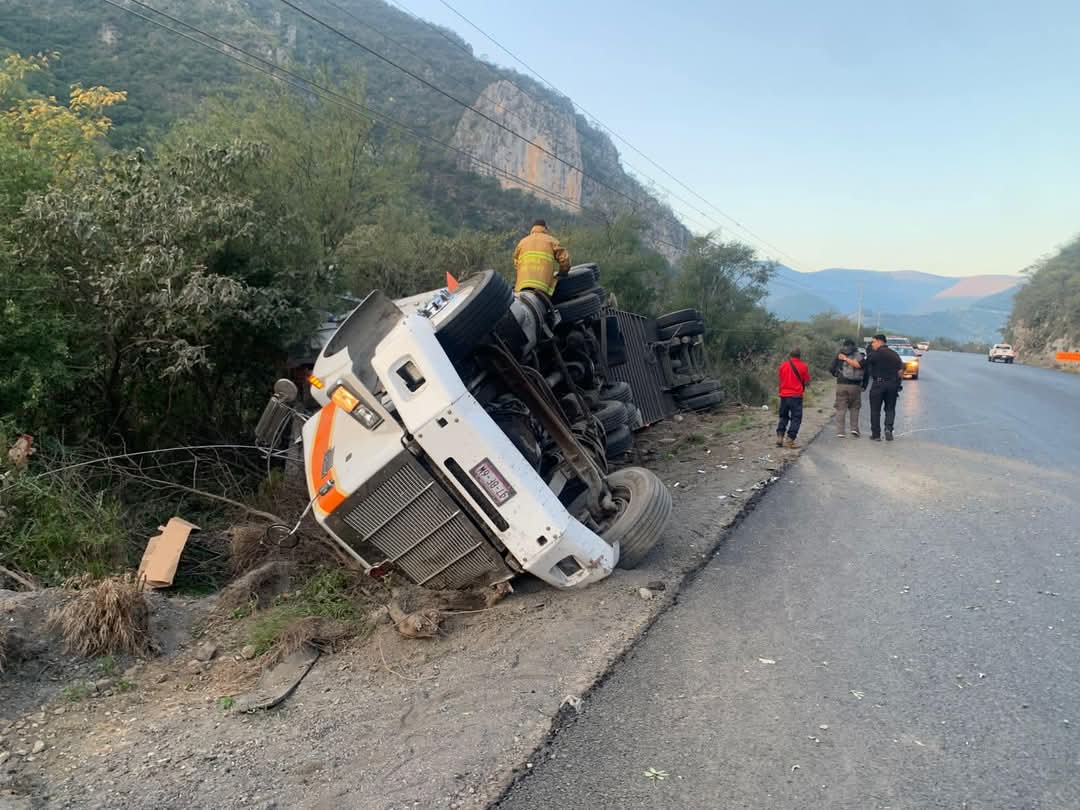 La pesada unidad, con razón social de la empresa López Leal Transportes quedó volcada a un costado de la carretera y encima de un poste de la CFE con cable de alta tensión.