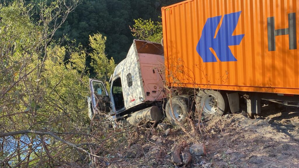 Esta mañana, un tráiler doble plataforma volcó en la Carretera Rumbo Nuevo, a la altura del kilómetro siete, lo que provocó el cierre total de la vialidad en ambos sentidos. El accidente involucró el segundo contenedor de un tráiler cargado con refacciones automotrices que viajaba desde Altamira, Tamaulipas con destino a San Luis Potosí.