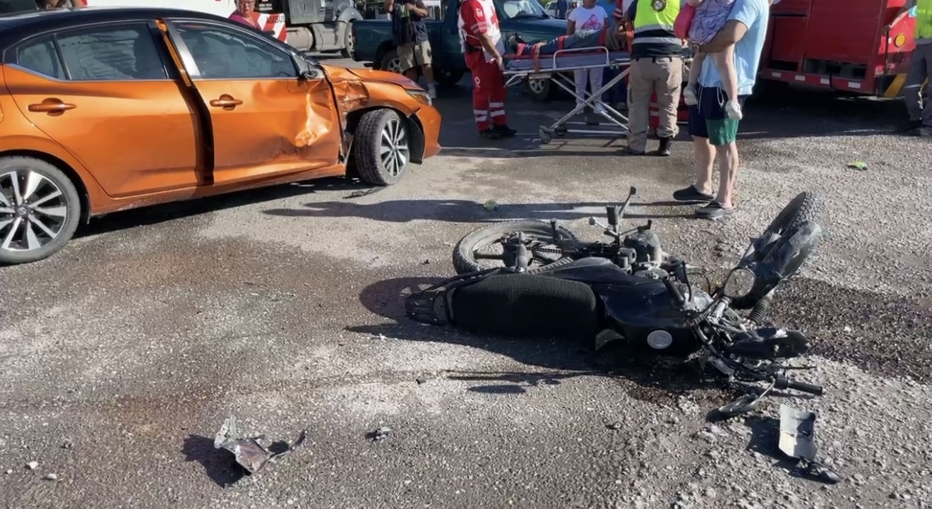 Esta mañana se registró un fuerte choque entre una motocicleta y un vehículo Sentra en el km 4 de la carretera Victoria – Matamoros donde viajaba una mujer embarazada.
